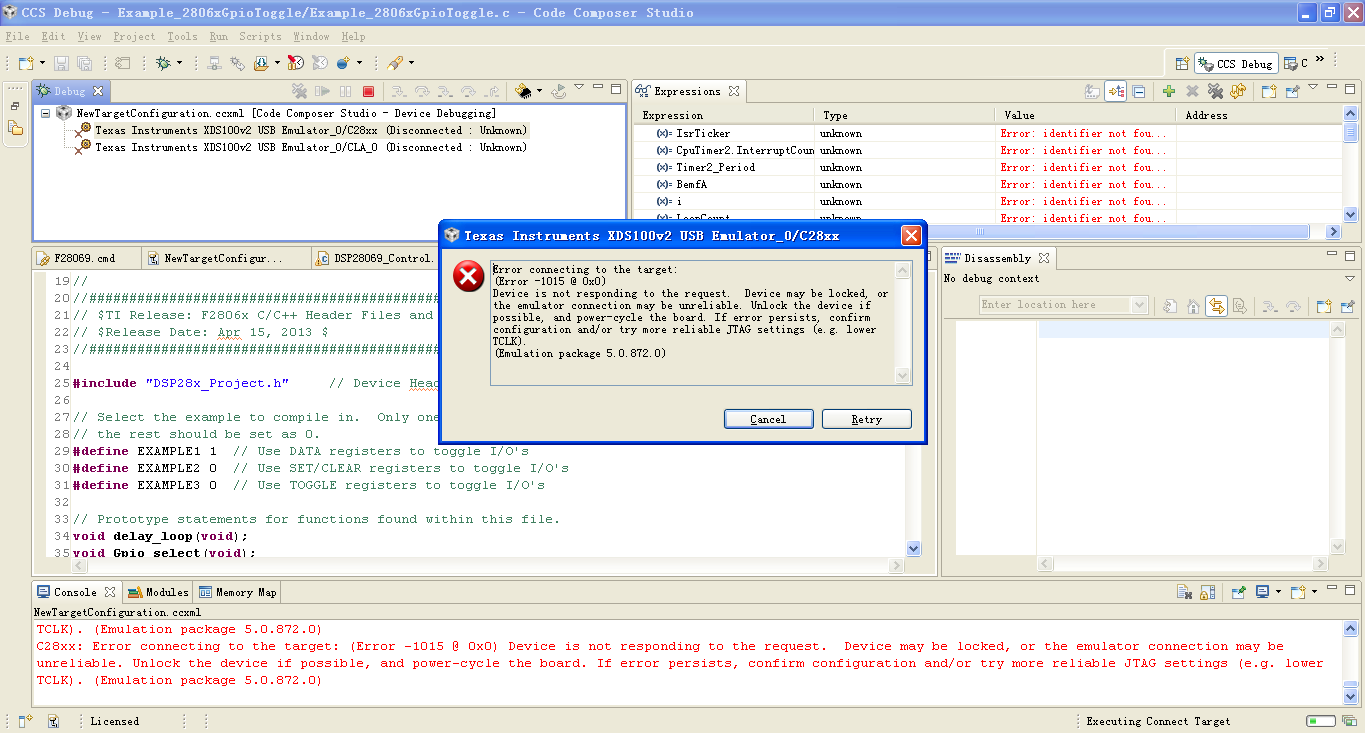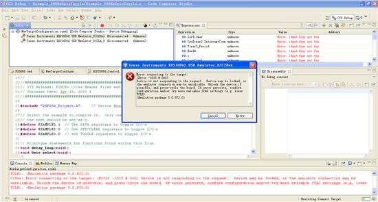 请教专家!!!!我用的是F28069的芯片,connect芯片时候出现下面这种问题。仿真器器不能连接芯片,可能被锁。