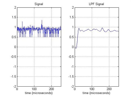 用上位机软件获取I_measure_L,与 I_filter_L的数据,I_measure_L的平均值为0.8820,而I_filter_L的平均值为4.8997。用matlab画图,得到的曲线如下图,图中红色线是ADC采集转换后的电流值,而绿色线是对电流值进行上述滤波后的值: