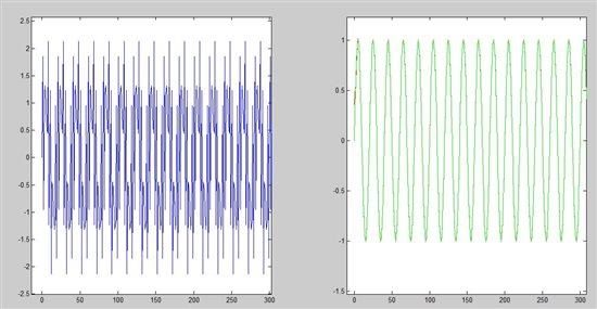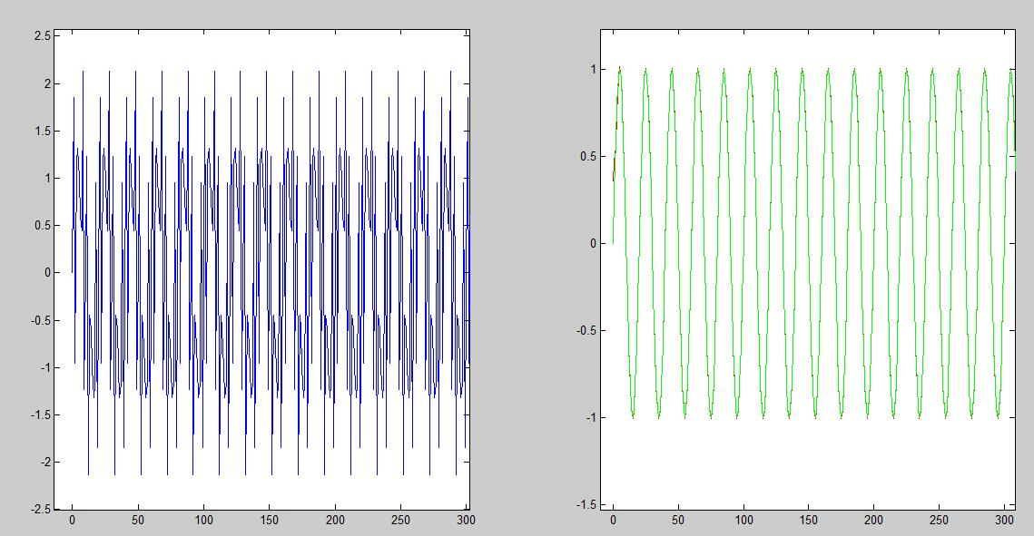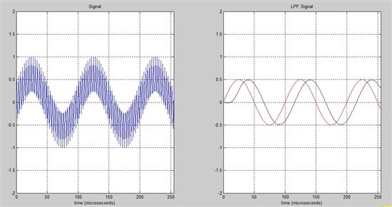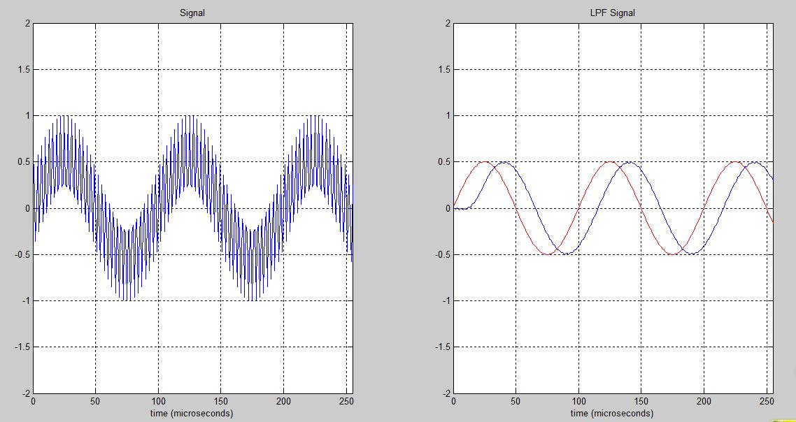 图中红色的理想滤波后信号,绿色为实际滤波信号。