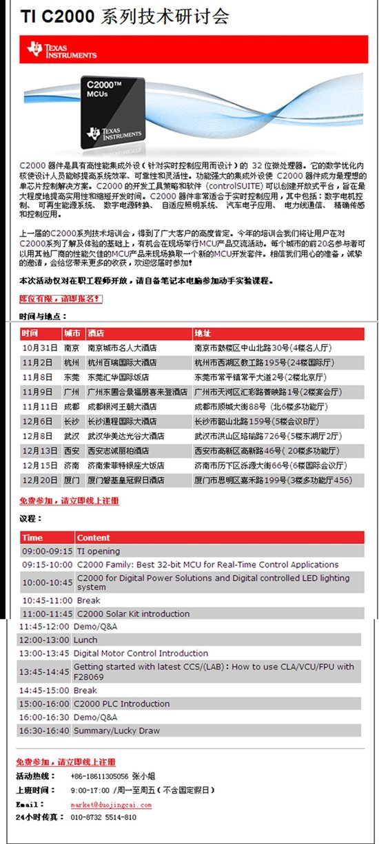 TI每次技术活动都是通过给客户发电邮的形式通知,C2000研讨会是第一次尝试通过TI社区这个平台同时来配合宣传,决定的有些晚了,下次不会了:)