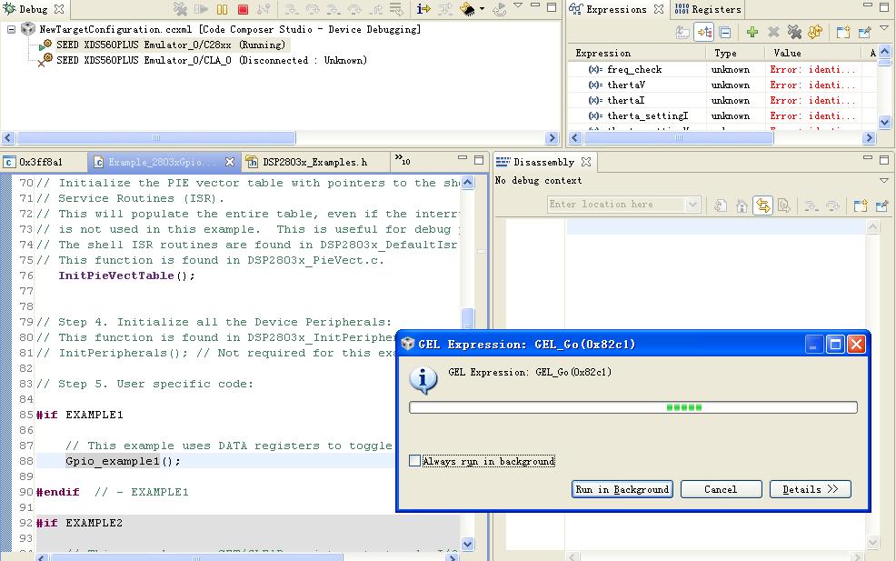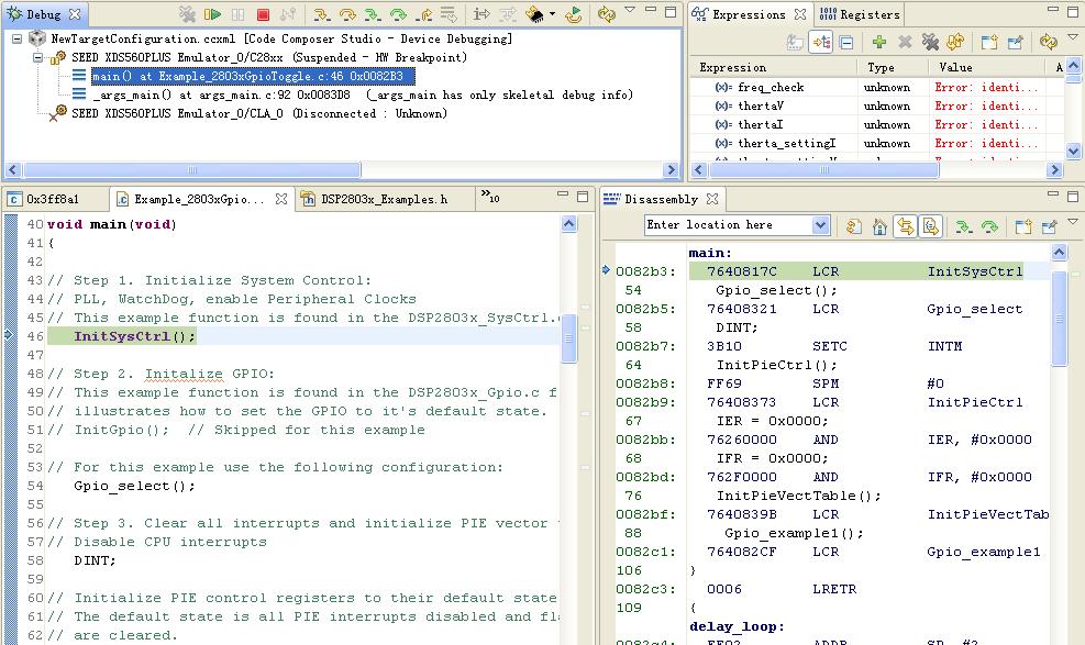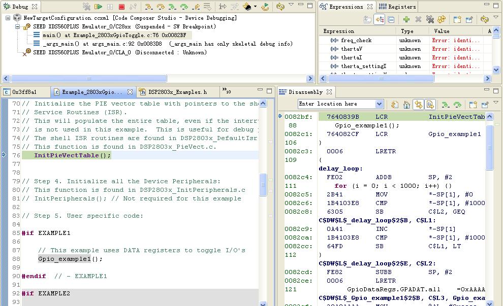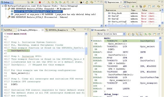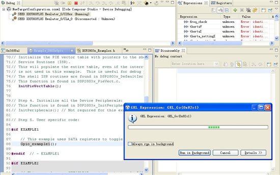初次使用F28035,仿真器能连接CPU ,程序能下载到CPU,但是运行过了PieVectTable初始化之后就不知道跑哪里去了,运行不到PieVectTable()下面一行,不知道还需要什么设置。