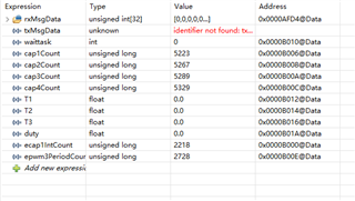 我使用了C:\ti\c2000\C2000Ware_4_00_00_00\driverlib\f28002x\examples\ecap\ecap_ex2_capture_pwm例程进行测试,但是发现捕获到的数据,在debug时cap1,cap2,cap3,cap4的值不一样,可是做差后数值一样,因此无法算占空比。然后设置断点,发现每次捕获到的数是一样的,不知道问题出在哪里