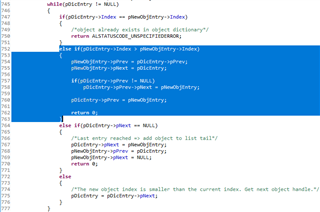 已建立链表的第一个对象的index值为0x1000,且每个对象(除去最后一个对象)指向下一个对象的指针均不为NULL,因此会重复执行图14高亮部分的代码,查找第一个index数值大于0x1C12的对象。找到这个对象后(0x1C32),将0x1C12对象插入到0x1C32对象的前面:
