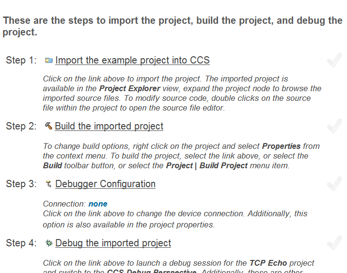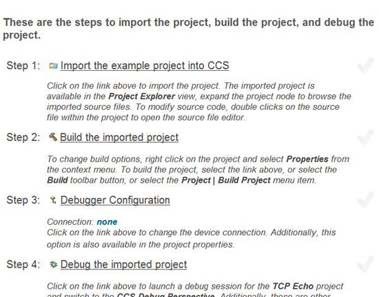 CCS TI Resource Explore打开的示例工程操作指引显示请参考下图: