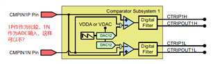 请教一下,CMPSS模块里,如果CMPIN1P如果作为比较输入,内部用DAC12做为参考源,那么CMPIN1N还可以做为ADC输入吗?