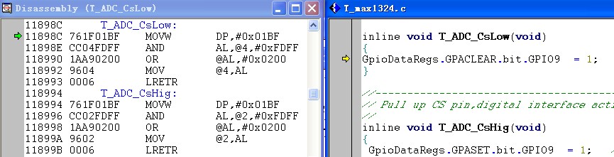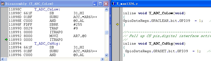 现在调试板子28335遇到问题,调用函数T_adc_Cslow(),运行到GPIO语句之前没问题,运行之后就发生itrap0 错误,如图所示,左边汇编,右边c语言。。。