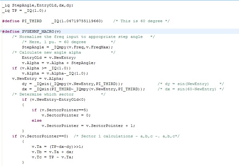 5.dy = _IQsin(_IQmpy(v.NewEntry,PI_THIRD)); /* dy = sin(NewEntry) */ \ dx = _IQsin(PI_THIRD-_IQmpy(v.NewEntry,PI_THIRD)); /* dx = sin(60-NewEntry) */ 这句代码中后面的解释我能看懂,但是解释中sin(NewEntry)程序中为_IQsin(_IQmpy(v.NewEntry,PI_THIRD)),这个NewEntry又乘了60度角,我又不懂了,请高手指点?