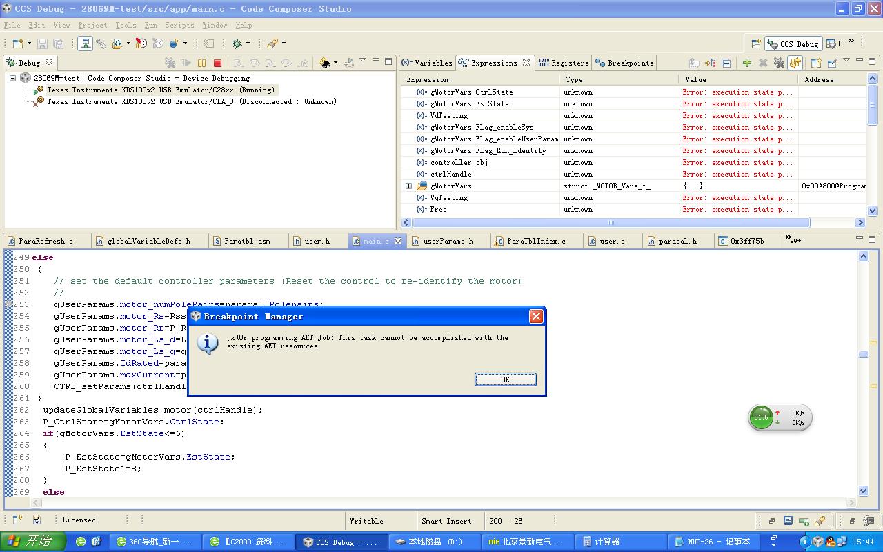 我在用CCS5 调试烧入到Flah中的F28069M的代码,在程序中设置断点时,报警programming AET Job:This task cannot be accomplished with the existing AET resources.,不能在程序中的特定行设置断点,但是有的行就可以设置断点为什么?求大神解答。图片见附图。