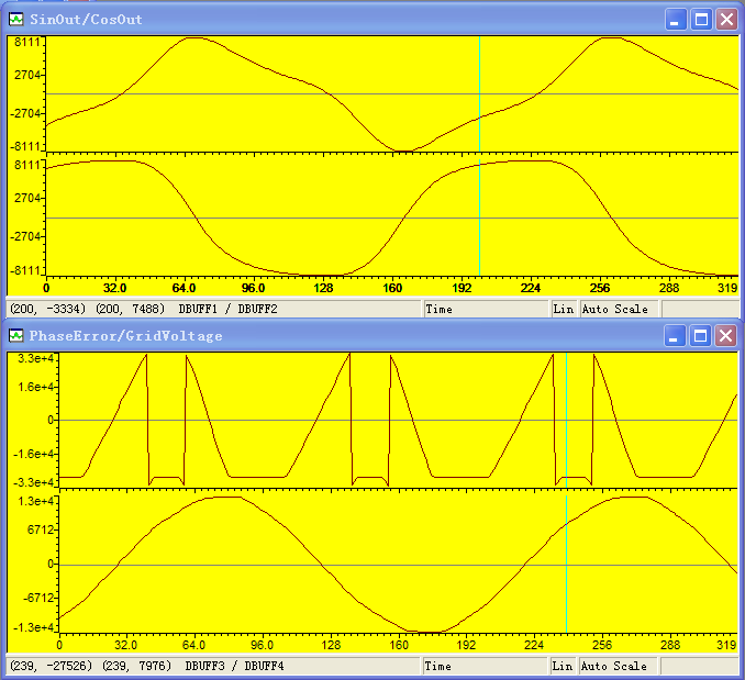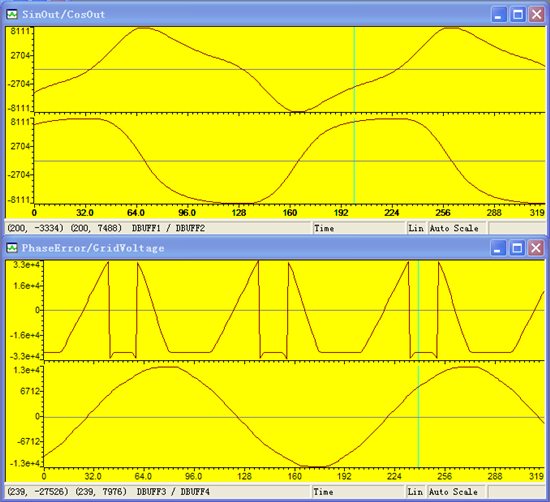 我最近移植了TI SolarHv_DCAC项目中的锁相环程序(50Hz),采样中断频率与SolarHv_DCAC项目一样,采样分压也基本一致。但是我的锁相环一直所不准,而且其生产的正弦与余弦也很不标准(如图)。请问有哪些需要注意的地方吗?