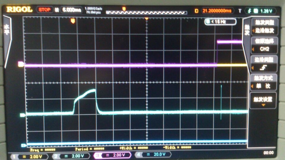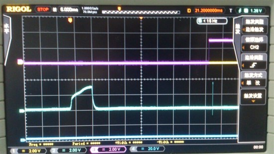 附波形,蓝色为EPWM2A上电时输出,紫线为复位信号