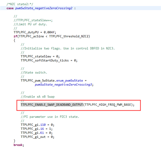 但是我看到TI写的状态机里边在NZC2时利用TTPLPFC_ENABLE_SWAP_DEADBAND_OUTPUT(TTPLPFC_HIGH_FREQ_PWM_BASE)将EPWMA 和 EPEMB交换了;NZC2后的状态是NZC3,NZC3后就进入negativeHalf负半周了,那么负半周EPWMA本应该是输送给控制管(即高频桥臂上管)的PWM信号不就给了同步管(即高频桥臂的下管)了吗,这样不就导致控制的极性刚好相反了,这也和我之前分析的相反,请问为何是这样呢。