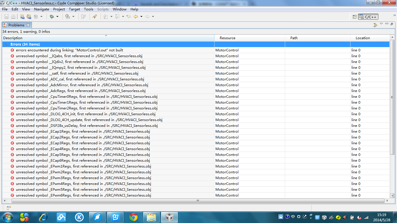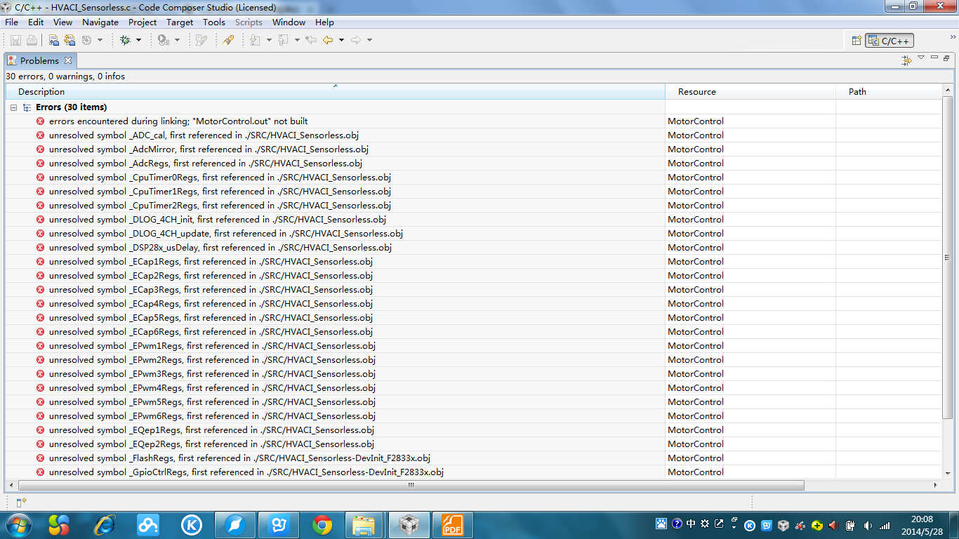 如题,我尝试着把controlsuit里面的HVACI_Sensorless_2833x工程导入进CCS4,先是很多头文件缺失,经过高手指点,终于把那些缺失的头文件找见并导入到CCS4里面,可是再编译的时候出现32个errors和一个warning,我把编译结果截个图传上来,烦请高手们帮我指导一下,并帮我分析一下出现这些错误的原因是什么,谢谢!!