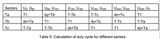 这是对应第一扇区得出来的三个比较值Ta,Tb,Tc.六个扇区对应的比较值如下,不明白2~6扇区的Ta,Tb,Tc比较值是怎么得出来的