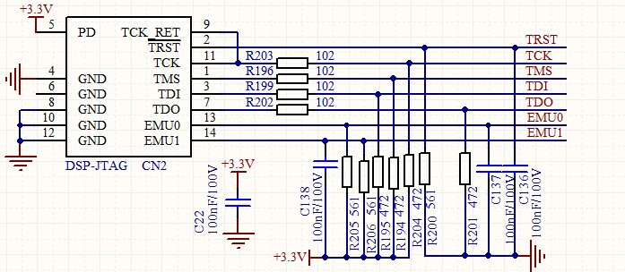 新焊接的电路板,程序可以下载至RAM 中运行,但烧写至FLASH时,unlock failed!,芯片我也换了好几片了。同样的现象。电脑及编程器的原因可以排除,因为我可以烧写tms 320f2812( jtag电路图不一样),下面是我的解不开锁的芯片JTAG连接图!