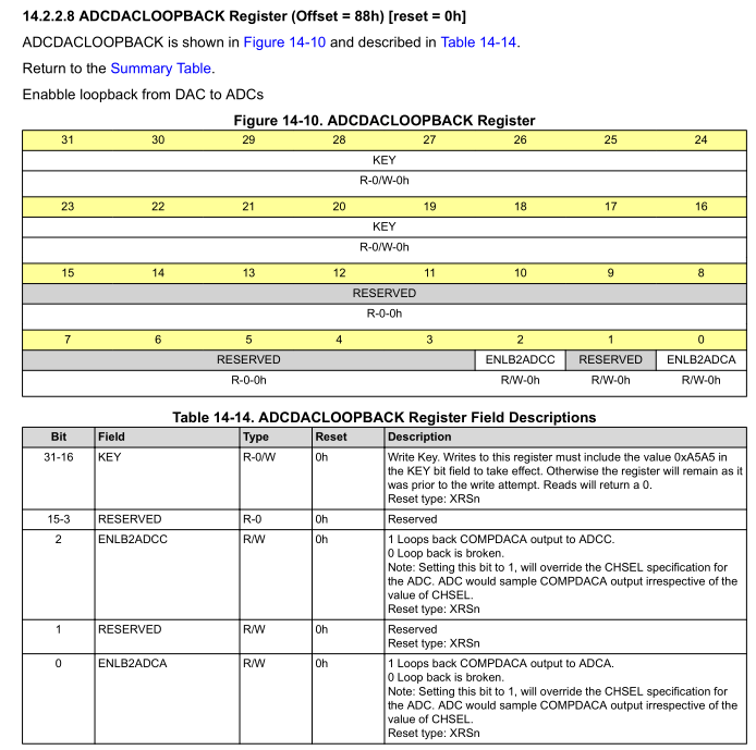 When the loopback bit is set, the ADC will sample the output of CMPSS1 DACL (low DAC). As long as the bit is set, the configured ADC will sample the DACL output regardless of what channel is selected (the loopback setting overrides CHSEL). There is a special acquisition window requirement when sampling the internal COMPDAC output - at least 4.3us (430 cycles at 100MHz SYSCLK). The DAC output effectively has a 7-bit resolution in this case, even though the input to DACLVALA is a 12-bit value (IOW, discard the last 5 LSBs).