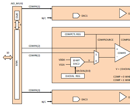 正在研究F28M35的内部比较器,从数据手册的图上看,好像只有COMPA2和COMP5D模拟信号的A、B引到了比较器中,其他的只有A和内部DAC引到比较器中,请问是这样吗?