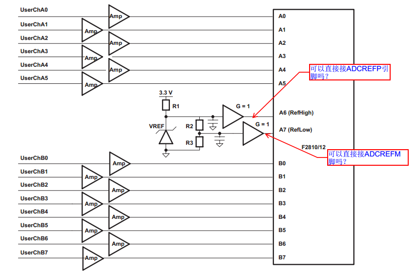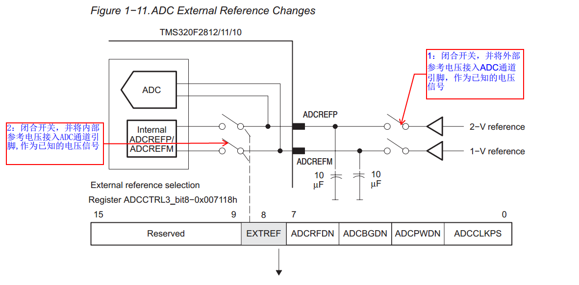 我在提高ADC精度的手册中看到图中的方法,所以想问可不可以用芯片自身提供的2V和1V电压?如果不可以,那么这两个引脚有什么作用?如果可以,需要注意什么?手册中有写到ADCREFP和ADCREFM也可以作为输入引脚,作为输入引脚的作用是什么?跟外部基准有什么关系?还有内部基准又是什么?