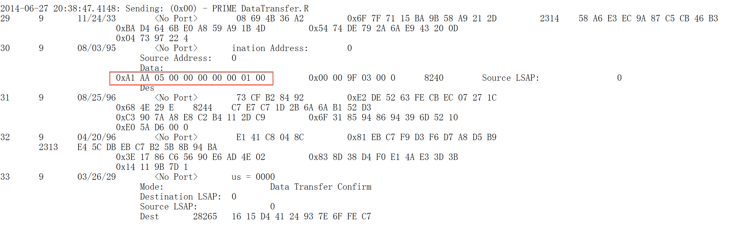 我用这套设备传输文件的时候,记录下了十六进制数据,但是看不明白,如下图。比如加红色方框那组数据0xAA 05 00 00 00 00 00 01 00.我想问: