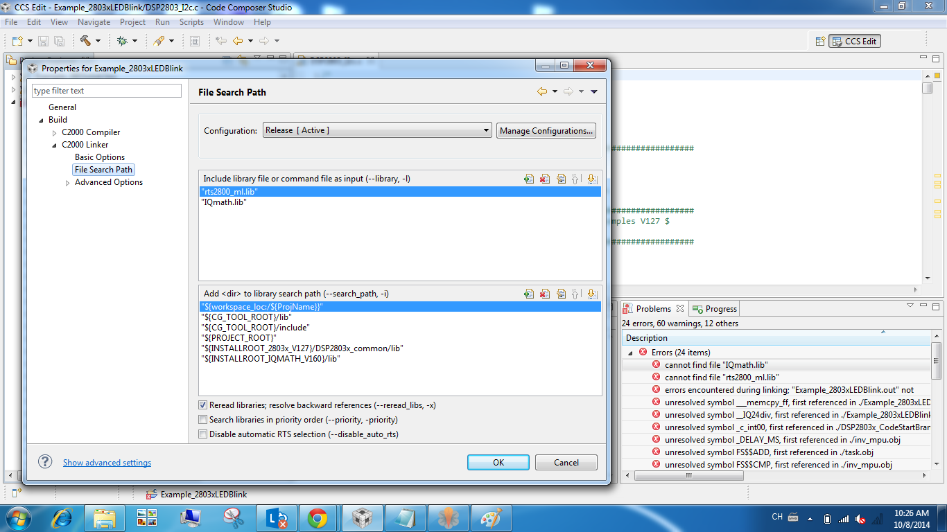 将工程copy到另一计算机后编译时不能通过,提示找不到IQmath.lib,rts2800_ml.lib
