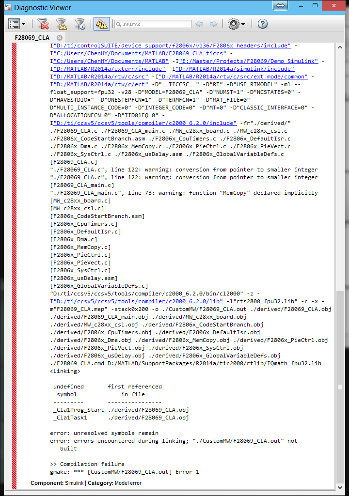 我在将Simulink自带的“Using the CLA with an LED blinking example”模型生成代码时,遇到了如下错误,请问该如何解决?