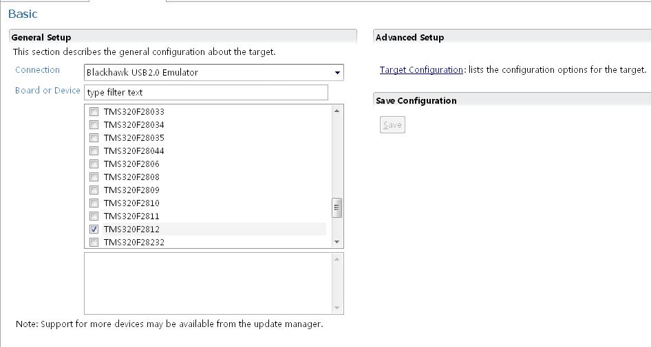 在程序中将目标板配置为tms320f2812,如下图所示,