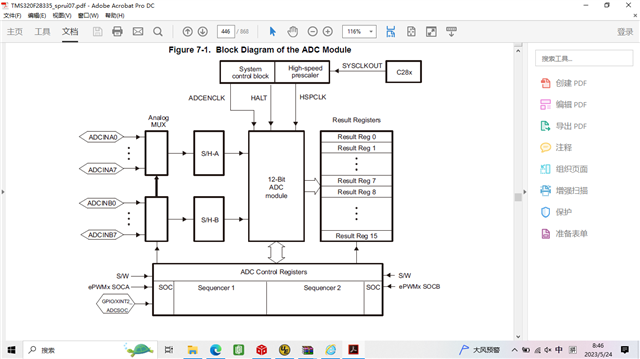 以28335为例,其只有一个ADC内核,但是有两个同步采样保持通道。这样可以使ADCINAn和ADCINBn同时采样保持。虽然后面的转换还是A在前B在后,但是是在同一时刻补货了两相电流值。两个通道转换结束后,触发ADC中断,在ADC中断中做算法处理。