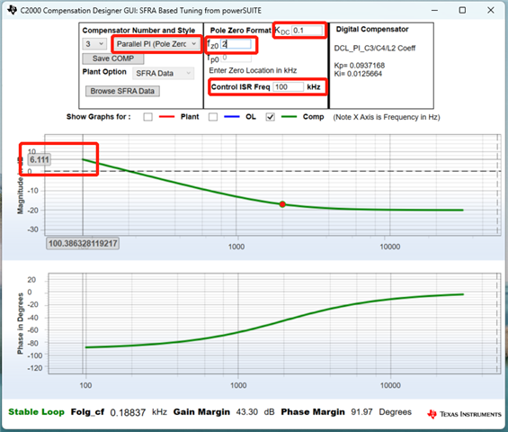 2、设定 Kdc = 0.1;fz0 = 2kHz; Control ISR Freq = 100 kHz