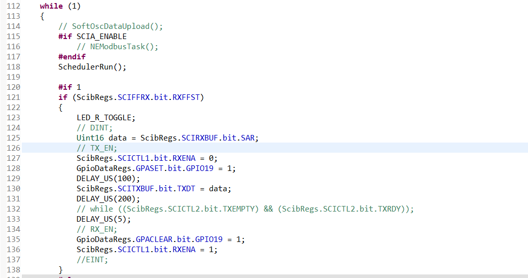 使用SCIB做485半双工传输,SCIB不使用中断,主流程一直查询,波特率115200,上位机(PCS)定时(5ms左右)向TMS320F28374S发送一个字节数据,TMS320F28374S在while(1)中一直查询缓冲区,检测到数据后,关闭接收使能(RXENA)并将接收到的数据发送出去,再开接收使能,如此循环,查询频率 < 500us。