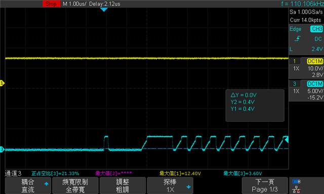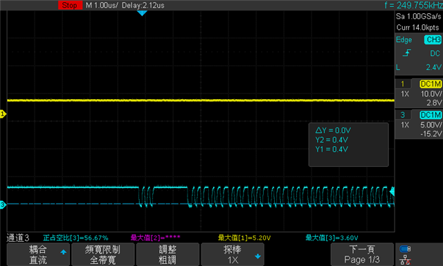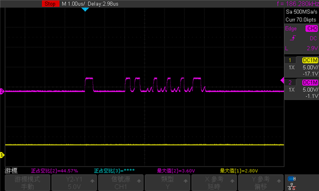 你好,我在測試BuckBoost的例程,我使用0039C的開發板燒錄後再跳線至主電路上,CCS的連接都沒有問題,但是我使用XDS110跳線至我設計的控制板燒錄連接主電路後發現當我將duty調整大於0.4,也就是操作在等電壓和Boost模式時控制板會和CCS斷開連接,我量測控制板的3.3V都很穩定,想請問這是甚麼問題。下圖是我duty從0.4調到0.5時輸出電壓(黃色)和控制板上3.3V(紫色)