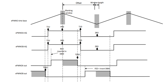 在中断程序中,我想让EPWM1A强制拉高,是应该配置AQSFRC的OTSFA以及ACTSFA还是配置AQCSFRC的CSFA,具体目的只是暂时拉高,在CTR=PRD以及CTR=ZERO事件发生时仍然按照AQCTLA定义来动作。具体像下图展示的一样,在中断中完成T1U事件拉高EPWM。