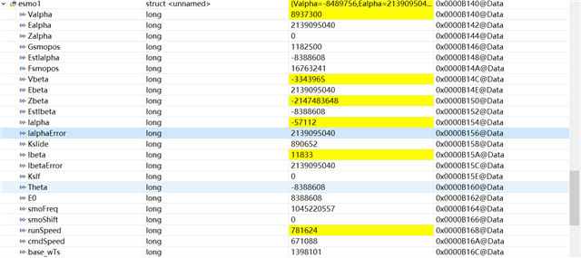 最近我在自己逆变器平台开发永磁同步电机无位置传感器算法,将计算得到的Iα,Iβ,Uα,Uβ送入开源smo模块能得到估计角度,但程序移植esmo算法后,按照给定例程将同样的Iα,Iβ,Uα,Uβ以及runspeed、cmdspeed送入esmo中观测角度始终是-IQ(0.5),将运行变量调出来查看后,发现IαlphaError和IbetaError出现数据溢出为_IQ(127.5),Zαlpha、Zbeta和kslf始终是0。IF开环运行速度上去后仍然是这种情况,请问这是哪里出了问题?