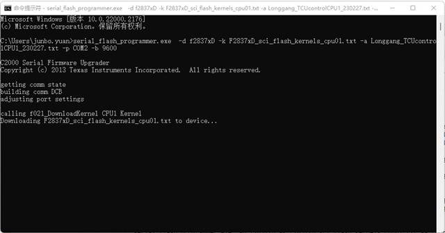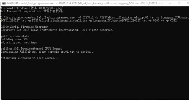 28377的引脚上电前配置成SCI boot,GPIO72=0、GPIO84=1,用到的文件serial_flash_programmer.exe、F2837xD_sci_flash_kernels_cpu01.txt、F2837xD_sci_flash_kernels_cpu02.txt、Longgang_TCUcontrolCPU1_230227.txt、Longgang_TCUcontrolCPU2_230227.txt放在同一路径,用的USB转串口线连接,上电进入CMD运行“serial_flash_programmer.exe -d f2837xD -k F2837xD_sci_flash_kernels_cpu01.txt -a Longgang_TCUcontrolCPU1_230227.txt -m F2837xD_sci_flash_kernels_cpu02.txt -n Longgang_TCUcontrolCPU2_230227.txt -b 9600 -v -p COM2”后停留在“Attempting autobaud to load kernel...”,使用串口端口配置无误,请问是什么原因了?用的z-tek力特工业级USB转串口线RS485/422转换器