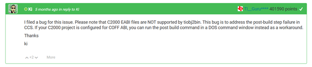 “${CCS_INSTALL_ROOT}/utils/tiobj2bin/tiobj2bin” “${BuildArtifactFileName}” “${BuildArtifactFileBaseName}.bin” “${CG_TOOL_ROOT}/bin/ofd2000” “${CG_TOOL_ROOT}/bin/hex2000” “${CCS_INSTALL_ROOT}/utils/tiobj2bin/mkhex4bin”您好,我看到了 TMS320F280039C: Post-build failed in CCS12.2 - C2000 microcontrollers forum - C2000︎ microcontrollers - TI E2E support forums,这篇帖子,用他的方法解决了一部分问题,但现在的问题就是,我如果选择COFF按他的方法没问题,但是如果选择EABI,那用他的方法就不能生成正确的bin了(bin里 全是0)