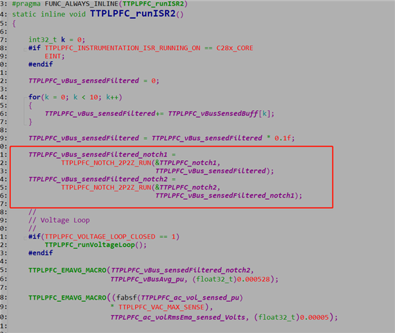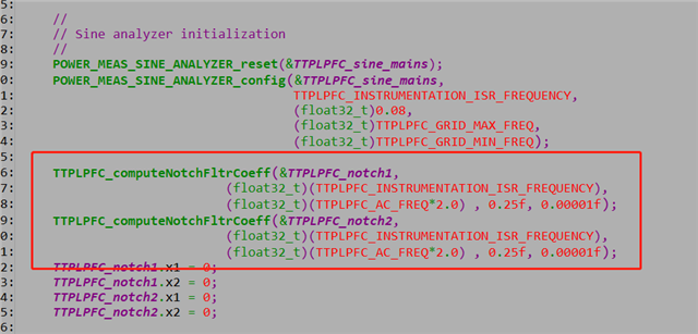 案例中电压环对反馈电压执行了NOTCH滤波,我不明白的是为什么要连续调用两次,滤波器的参数都是一样的。例程截图如下:
