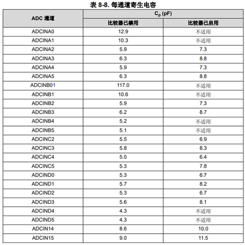 请查看zhcsc63o_TMS320F2837xD 双核微控制器 datasheet (Rev. O)第110页8.10.1.2.6.2 单端输入模型参数的表 8-8. 每通道寄生电容