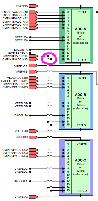 2.如果把ADC分配给了不同的cpu核,比如ADC-A、ADC-B分配给cpu1,ADC-C、ADC-D分配给cpu2,那么是不是这两个 核都可以读取ADCIN14和ADCIN15呢,而其他引脚却不能两核公用呢?谢谢