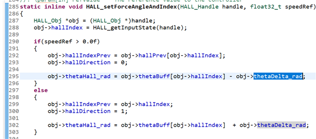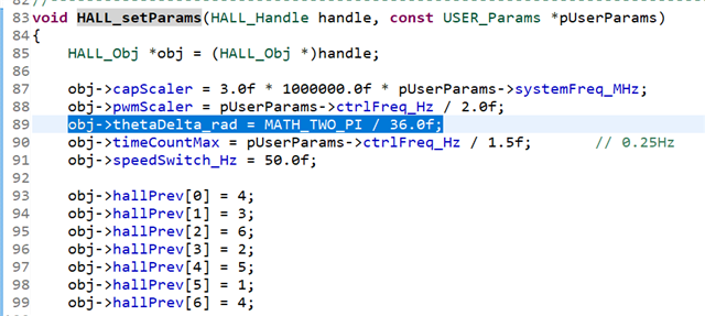 我在运行C2000Ware_MotorControl_SDK_5_00_00_00\solutions\universal_motorcontrol_lab实验例程,选择的是HALL有感FOC,在hall.h头文件中,为什么当霍尔状态发生变化一次,角度的增量thetaDelta_rad要变化2Π/36,三相霍尔状态每变化一次,角度增量不应该是Π/6吗?