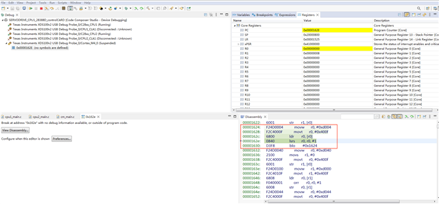 我目前使用28388D自制板并使用自建工程去实现M4核的Ethernet和EtherCAT功能,现目前已经实现了Ethernet和EtherCAT的正常通信,但有一个现象是,当我在CCS中Debug时,执行网口和EtherCAT通信时,M4核在运行大概10分钟左右(时间不确定)后,会出现程序跑飞现象:Break at address "0x162e" with no debug information available, or outside of program code.
