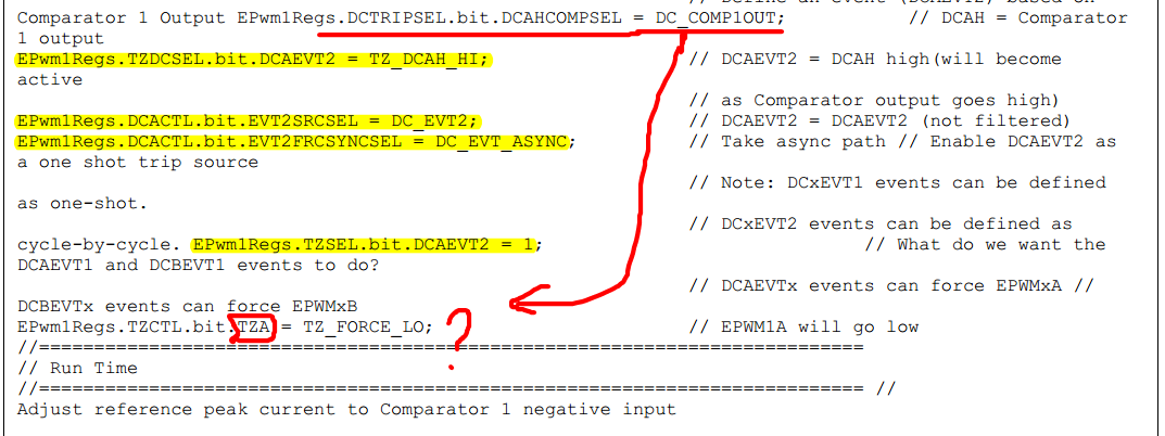 我的问题是:为什么配置中事件触发用的是COMPxOUT作为DCEVT2输出,但是在配置动作TZCLA时用的却是TZA呢?