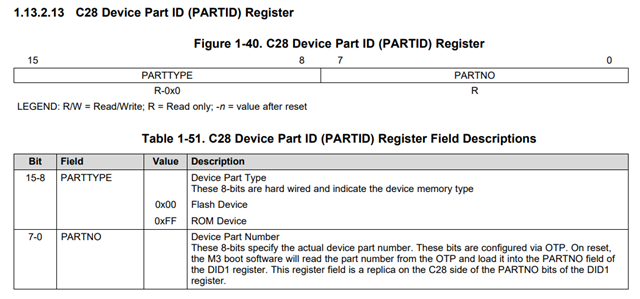 TI工程师您好,手册上明确记载了F28M35系列的DID1.PARTNO寄存器的值所代表的芯片型号,但是F28M36系列并没有记载,我翻遍了TI提供的手册,都没有记载这个具体值,您能帮忙查看一下吗,谢谢!