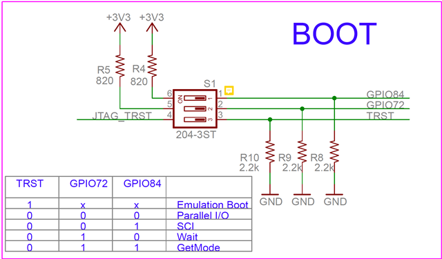 我使用的硬件设备为28379D LAUNCHXL,在尝试使用串口烧录程序,参考了官方提供的《C2000串口烧录程序》,通过改变拨码开关而切换到串口启动方式,如下图,将2和3拨到off,即可