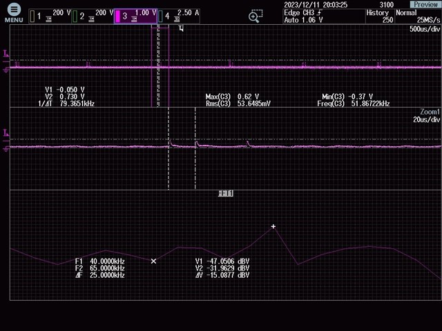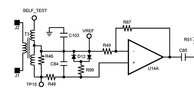 2.当我将自检电路后端接到电流互感器的次级时(初级空着)如下图,白噪声消失具体如下(我尝试拆除C84和C103,结果一样):