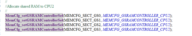 工程师您好,我最近在CCS11.1上调试F28388D,由于我在CPU2核中进行了大量的数据计算,导致我CPU2的RAMLSx 已基本使用完毕,于是我使用了MemCfg_setGSRAM函数,将RAMGS0~RAMGS4 部分分配给了CPU2,如下图所示: