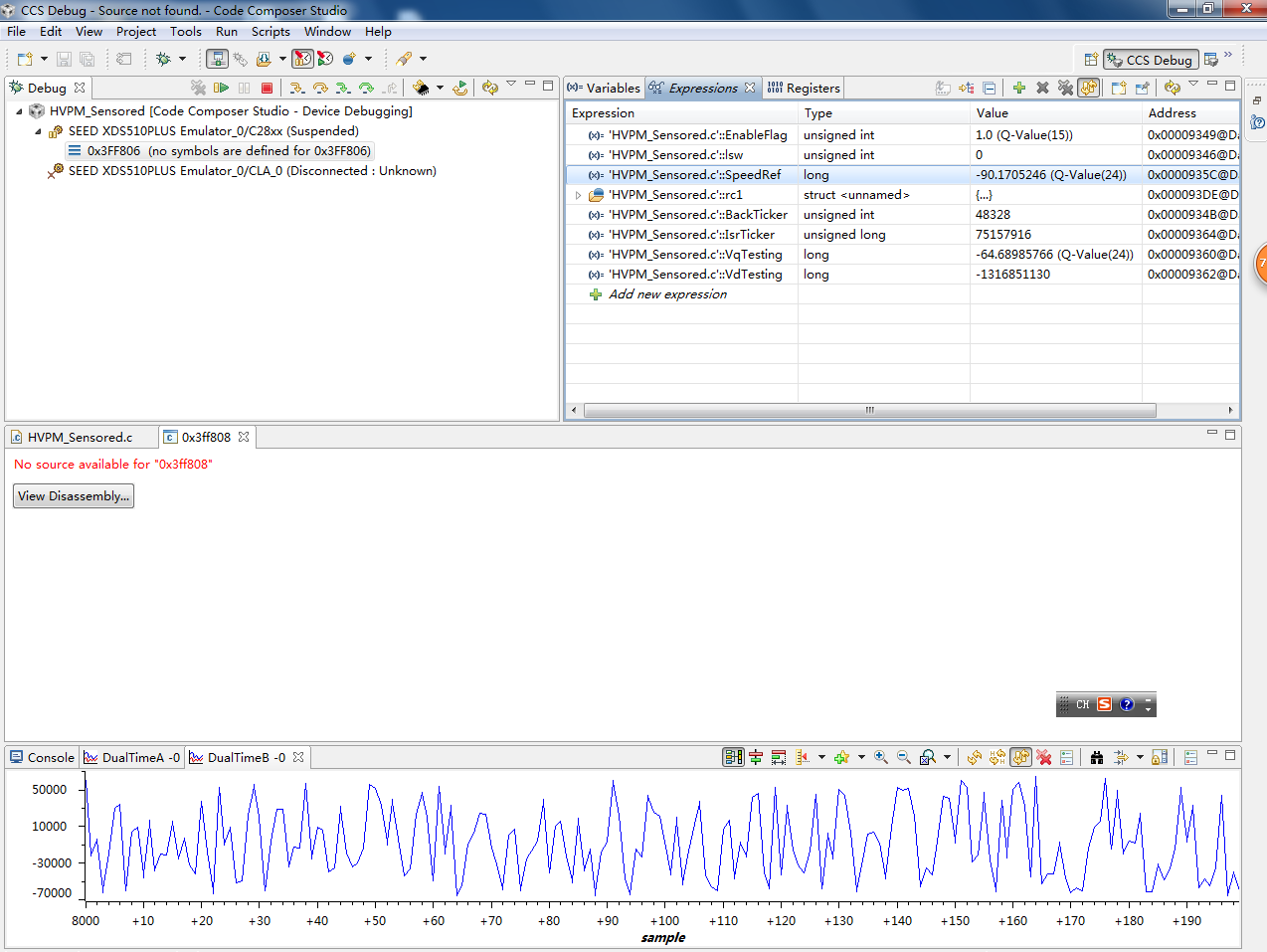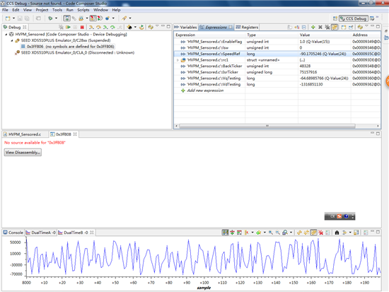 大家好,我最近在学习F28035的电机控制的历程,在烧进hvpm-sensored程序时,用graph看到的ta很奇怪,如图,求助TI 人,十分感谢。