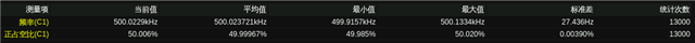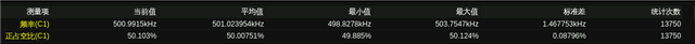 3.设定501kHz,TBPRD=119,TBPRDHR=0xC300;可以看到示波器测量到的频率在498.8kHz~503.7kHz间波动,平均值是501kHz