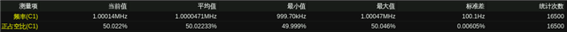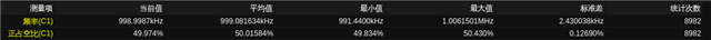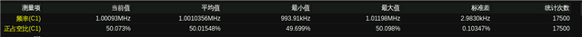 5.设定1001kHz,TBPRD=59,TBPRDHR=0xF100;可以看到示波器测量到的频率在993.9kHz~1.01MHz间波动,平均值是1001kHz