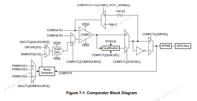 F28023内部比较器在开启滞回后,如何定性分析对电路的影响?比较器输出端的内部结构是什么样的,是否等效为100KΩ电阻上拉到3.3V?