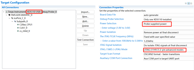 现在想利用XDS110为目标板供电,不外接电源。XDS110配置如下:
