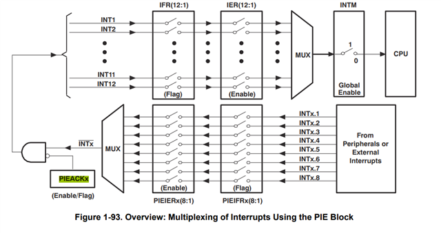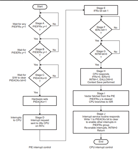 另外对于第二个问题,出处是SPRUH18I 2022 JUNE修订版 P169  图1-94中, Stage J有提到需要将其清零,且在Stage C有提到会判断PIEACKx是否为0。我在程序中做了一个20us的timer 0中断,在ISR中并没有将PIEACKx清零,但是还是能够正常进入中断,这里蛮困惑的。