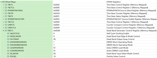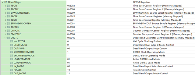 图3 将demo板restart后,再次运行至while(1), EPWM DBCTL的配置情况